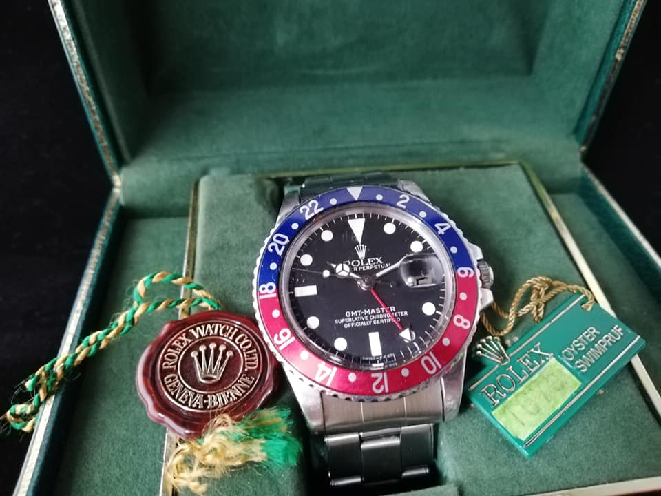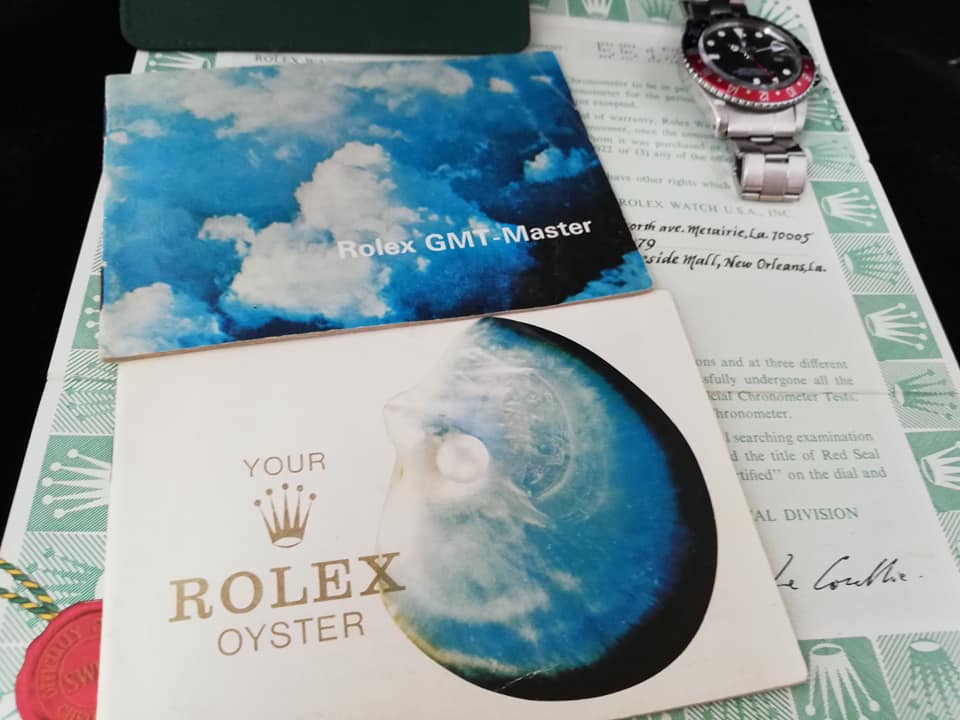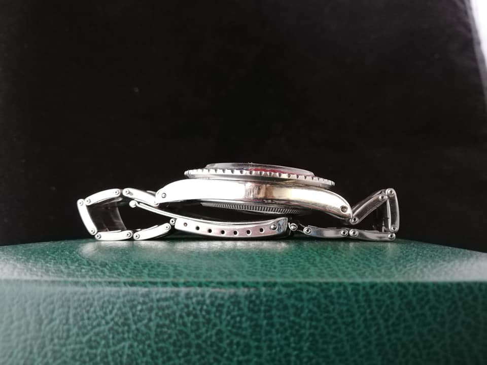 Deze stalen GMT Master is een ware collectors dream: alles is er bij. Het horloge is geproduceerd in 1978 en op 26-10-1978 in de USA ingevoerd. De code daarvan staat op het certificaat. Destijds is het horloge gekocht door meester-graveur Sam Alfano. De papieren heeft hij zelf in mogen vullen met een kalligrafie pen. Verder is de GMT master alsof het net de bij Rolex is gemaakt. Natuurlijk heeft het lichte gebruikssporen, dat kan ook niet anders, want het is nooit gepolijst. De wijzers en de uurmarkers zijn nog nagenoeg wit/licht creme en absoluut origineel. Het uurwerk is in 2008 bij Martens geserviced waarbij de kast origineel is gelaten. Beter wordt het niet als het om vintage Rolex gaat.